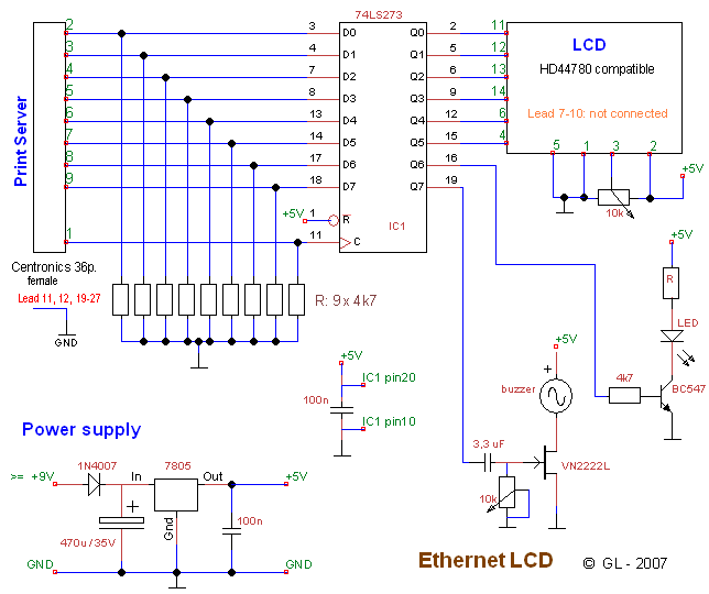 Van deze laatste versie wordt hier gebruik gemaakt: data, die (via het netwerk) naar de print server gestuurd wordt, wordt doorgegeven als 8-bits parallelle data op de (blauwe) Centronics connector. Met deze data wordt het display aangestuurd.
